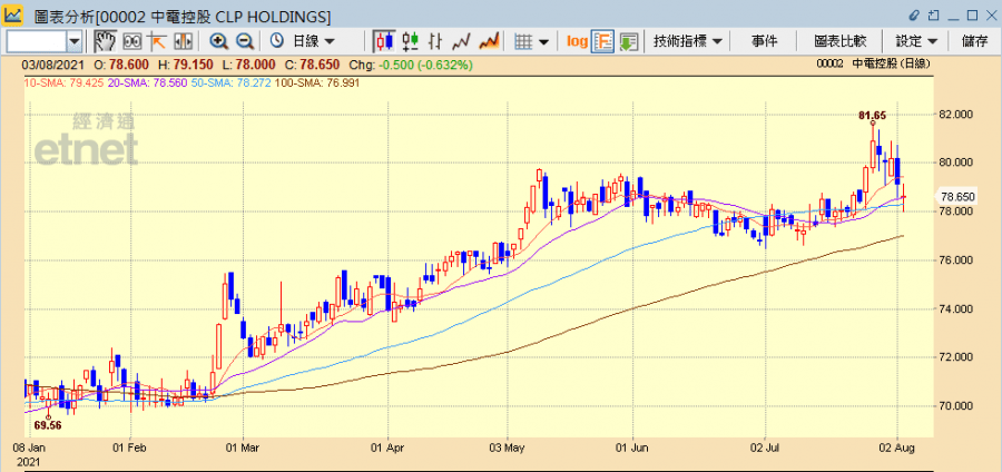 中電昨(2日)公布業績後股價下跌1.31%,今日(3日)再跌0.63%收報78.65元,兩日累跌約2%,但仍守於50天線之上,預期周息率3.992%。大行一般雖認為其業績略遜預期,但因具防守性可續持有。其中摩根大通發表研究報告指,中電營運盈利稍為遜於該行和市場預期;而第二期中期股息持平,亦低於該行增長1%的預測,給予「增持」評級,目標價90元。報告指出,由於內地的高煤價以及澳洲的利潤壓力,預料中電下半年盈利前景依然無驚喜,但因為香港2050年碳中和目標將推動可再生資本支出,故中電的盈利有望提高。而中電從香港的利潤管制協議中獲得60%的收益,在最近的市場波動中,中電在防守力上具有優勢。花旗發表研究報告則指,考慮到中國內地及澳洲業務的貢獻減少,將中電2021至2023年的純利預測調低3至6%,將中電的評級由「買入」下調至「中性」,目標價亦下調1.7%至85元。該行修訂後的2021年純利預測較市場共識預期還要低9%,但考慮到集團的現金流足以維持派息,故該行僅將評級下調至「中性」,而非「賣出」。