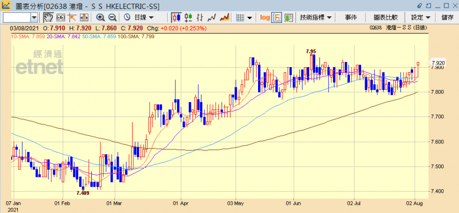 至於今日公布中期業績的港燈,集團公布截至6月底止6個月,純利8.8億元,按年升8.5%;每股基本盈利9.96仙;派中期股息15.94仙,與去年同期持平。期內集團收入52.49億元,按年升9.35%;分派總額18.04億元,按年持平;未計利息、稅項、折舊及攤銷前溢利為36.4億元,按年升13.61%。港燈主席霍建寧表示,基建項目進展令人滿意。當中,L11和L12兩台容量各達380兆瓦的燃氣聯合循環發電機組施工如期進行,可望分別在2022年及2023年投產。海上液化天然氣接收站項目工程亦預計可於明年投產,使集團可直接從國際市場購買液化天然氣。另集團計劃大幅增加天然氣發電,令燃氣發電比例由現時約50%提升至2023年約70%。售電量方面,較去年同期增加1.9%。港燈公布業績後股價平穩變化不大,今日收報7.92元升0.25%,預期周息率4.167%。