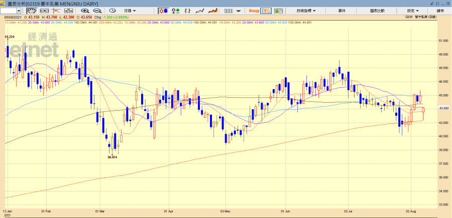 A股亦受壓,伊利股份(滬:600887)跌1.914%,報34.34元人幣;貝因美(深:002570)跌1.89%報5.7元人幣。
