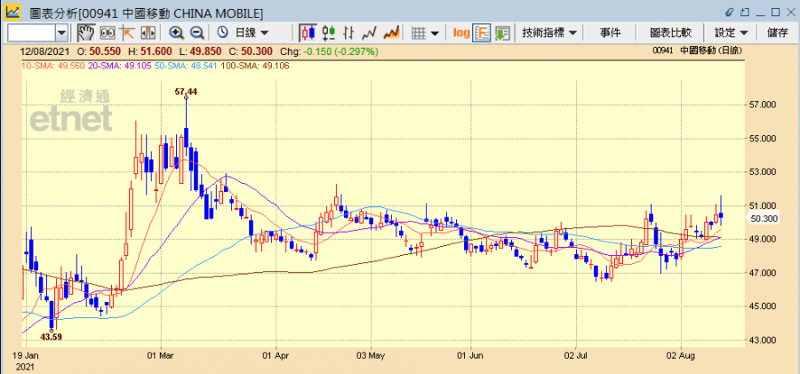 中移動上半年無論純利和通信服務收入等,均優於券商預期,且增派息,「回A」計劃亦積極推進中,今日逆市曾升逾1%,收市則微跌0.3%報50.3元。