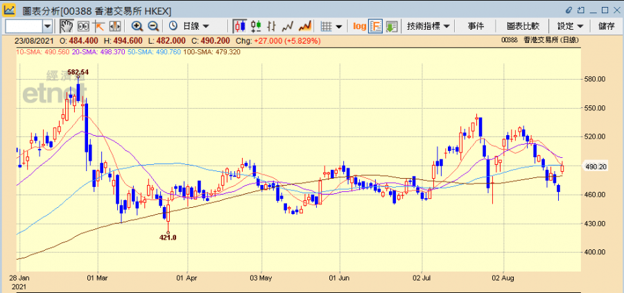 港交所半日升5.83%收報490.2元。(經濟通HV2系統截圖)