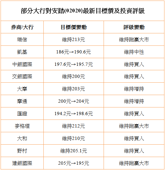安踏業績強勁,惟大行看法不是那麼正面,雖大多維持跑贏大市或買入評級,但部分調低目標價,如建銀國際由205元降至195元,中銀國際則由197.6元降至195.7元。其他大行亦不見大幅調升目標價,摩通僅由200元升至204元,匯證由194.2元升至198.6元,凱基由186元升至190.6元。綜合眾大行的目標價由190.6元至213元不等。