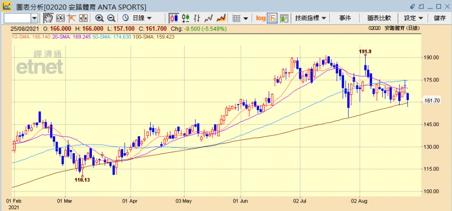 安踏昨公布業績後股價反覆,曾升近3%,高見175元,其後一度倒跌,全日收市僅升0.6%至171.2元;今日一開市則跌3.04%報166元,其後跌幅擴大,曾急跌7.13%報159元,一度跌破百天平均線(159.396元),盤中低見157.1元,半日收市仍跌5.55%報161.7元,成交18.8億元。至於其他體育用品股表現也不太好,李寧(02331)半日跌0.84%報94.95元,361度(01361)跌1.07%報3.71元,特步(01368)跌2.33%報13.42元。