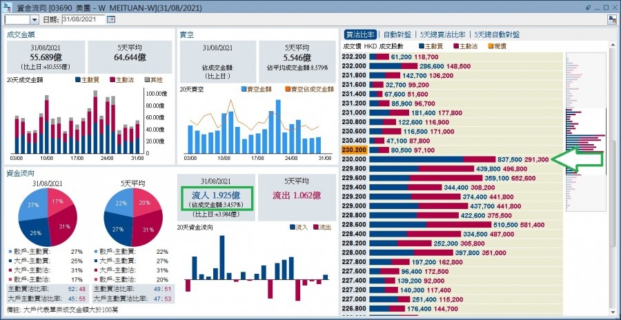 根據《經濟通HV2報價系統》,美團半日有1.92億元資金淨主動買入,雖只佔成交金額逾3%,規模不大,惟已扭轉過去連續四個交易日的資金淨主動賣出。不過,細心研究成交分析,美團半日的買家較集中在單宗交易成交金額少於100萬的散戶,因計及所有市場參與者的交易的主動買沽比率,較中戶及所有大戶的理想,達52:48,惟尚未達55:45的及格水平;即市好淡分水嶺於230元。
