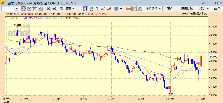 市場預料水泥價格未來持續上漲,加上今年前7個月地方債整體發行規模不足全年額度的一半,料下半年將加快發債進度,連帶全國各地工程建設支出料將大增,刺激水泥及建材需求上升,水泥股成為近期熱炒板塊,今日(1日)持續強勢普遍急升。
