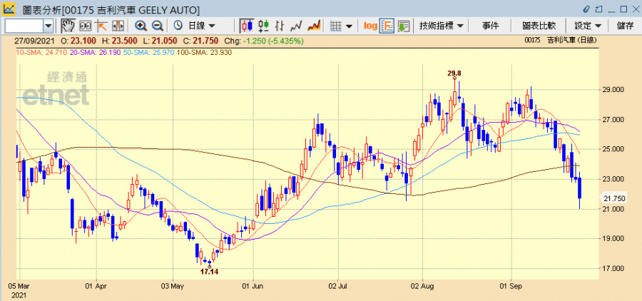 近期內地車市受累芯片供應短缺問題,一眾汽車股股價亦持續弱勢,其中吉利汽車(00175)雖有已開發多款慳油甲醇車,以及旗下網約車平台曹操出行融資不斷等利好消息,但無助股價止跌,今日(27日)再插半成。