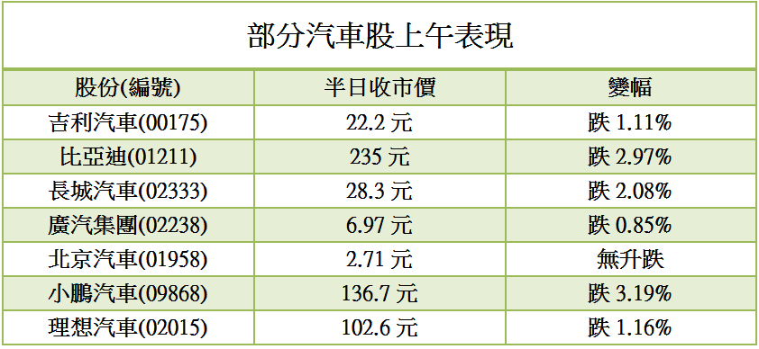 汽車股近年受惠內地鼓勵新能源車生產而多番炒作,但近日據報當局將以減少碳排放新政策取代新能源車積分機制,車企碳排放較高車型減免處罰優惠有機會被取代,而另方面又臨近10月初公布汽車銷售成績日子,令市場擔心芯片荒持續影響汽車產銷,拖累汽車股延續弱勢,今日(29日)全線下挫。