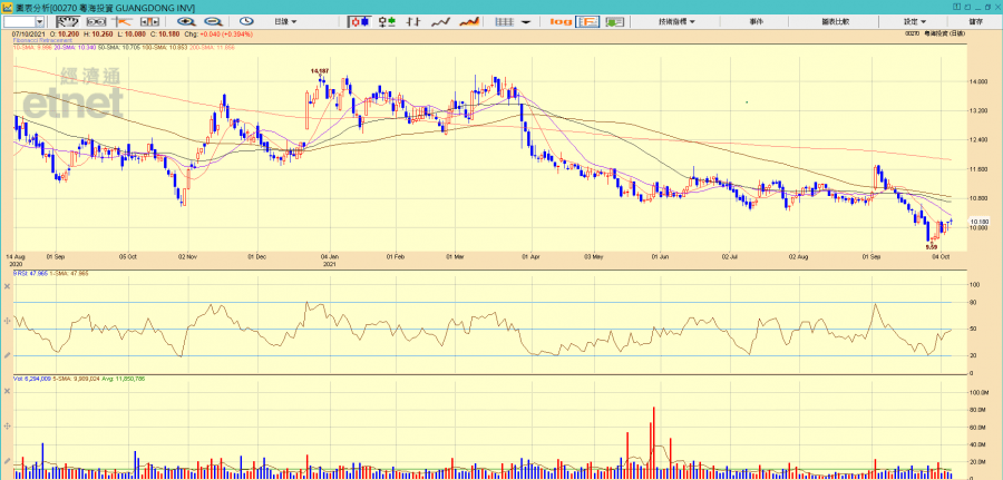 大市未有明顯回穩,套現卻要蝕通脹(持現金),投資者可以選擇一些有穩定派息能力的股份作避險之用,例如業務主攻水資源項目的粵海投資(00270),現價市盈率近14.6倍的三年低、市帳率近1.5倍的9年低,周息率近6厘,現價屬相當平。不過該股本周五除淨後或重啟跌勢,而下文將提及的限電、內房股下挫等問題未見可於短期內緩和。技術上看,現價已跌穿五十月線,反映出現中線下行趨勢,若投資者有意買入,建議在股價收破6月至9月的橫行區低位10.46元(即除淨後10.28元)方作考慮,收穿9.67元(即除淨後9.49元)止蝕。
