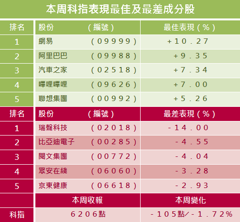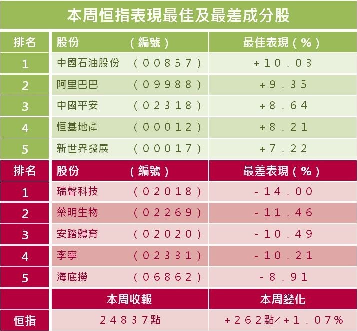 恒指本周在23681點至25064點間波動,上下波幅1383點,全周升262點或1.07%,收報24837點;國指本周在8359點至8775點間波動,上下波幅416點,全周升49點或0.57%,報點;科指本周在5824至6206點間波動,上下波幅382點,全周升105點或1.73%,報6206點。