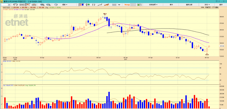 恒指比重高達6.9%的美團(03690)雖遭內地市監總局處罰34.42億元人民幣,但股價不跌反以裂口高開於270元,初段波動性較大,最低僅曾跌至265.6元,但仍高過上周五收市價256元,最高則曾見278元,及後在272美元以上呈橫行形態,這反映市場已消化了相關的「二選一壟斷處罰」。監管風波對市場的影響有望逐步消退,在重磅成分股逐步回穩及回升的情況下,恒指應可避免下試2020年3月份的低位21139,並維持長期上升形態,惟料3萬點仍是難以突破的重要關卡!由於阿里走勢貼近恆指,故短期應較值博,並以210及220元為上升目標。