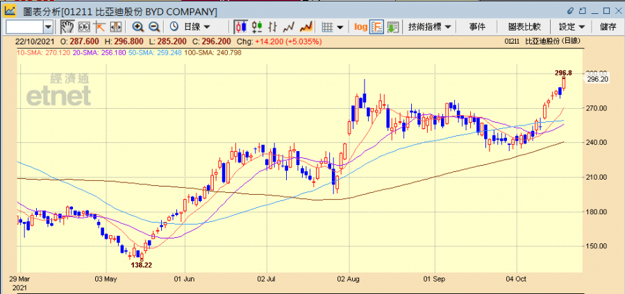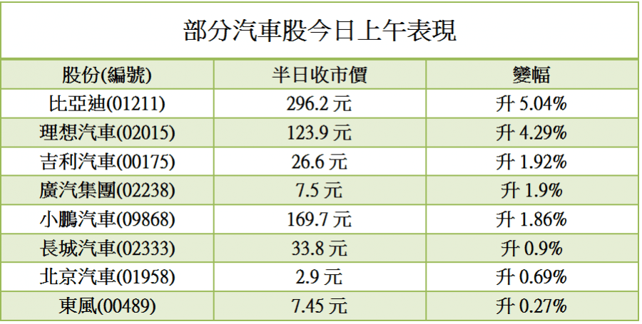 Tesla季績理想,股價創出收市新高,帶動昨晚中概電動車股全面上升,升幅由0.48%至2.63%不等,比亞迪在美股ADR也上升3.5元。今日港股早市汽車股亦受刺激股價普遍上揚,其中比亞迪半日升5.04%報296.2元,成交約21億元。