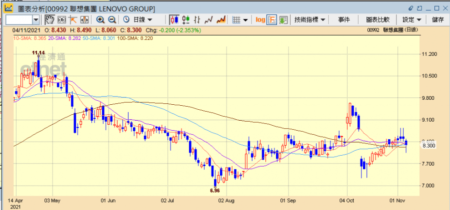 聯想績後股價直線下滑,曾急跌半成,一舉插穿多條移動平均線,收市仍跌2.35%收報8.3港元,成交6.1億港元。