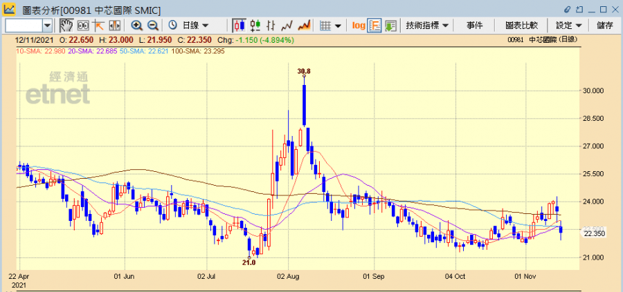 中芯今日最多曾跌逾半成,跌穿22港元,半日則跌4.89%收報22.35港元,成交20.86億港元。