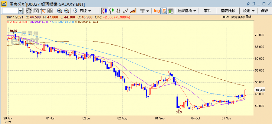 《異動股》銀娛(00027)升近5%,報46﹒4元