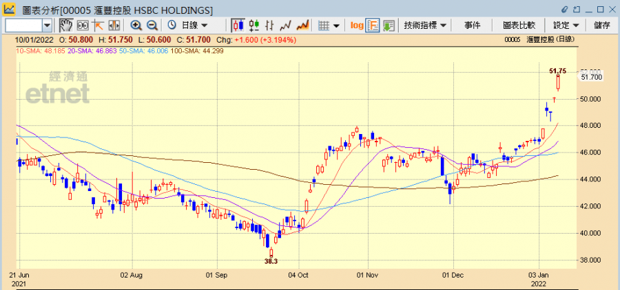 匯控收市升3.19%報51.7港元,最高見51.75港元,是2020年3月5日52.1港元後最高,成交30.64億港元。恒生(00011)升1.98%報154.6港元,中銀香港升2.87%報28.7港元,渣打則升2.37%報51.85港元,東亞亦升3.25%報12.06港元。