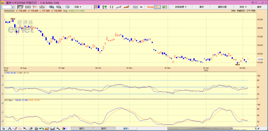 在阿里巴巴的日線圖上,RSI及STC則有勢轉為利好。