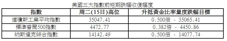 美股三大指數近日走勢相若,前短期跌浪皆於本月9日開始、14日結束,歷時共四個交易日。以各自的跌幅及隔晚錄得的高位計,道瓊斯工業平均指數及納斯達克綜合指數均升抵前跌幅的0.5倍量度升幅目標(詳情請見下表)。不過,仔細看,納指表現較佳,皆因其較接近下一個、即0.618倍量度升幅目標14175.2,差距只有0.2%,惟道指則有0.6%。
