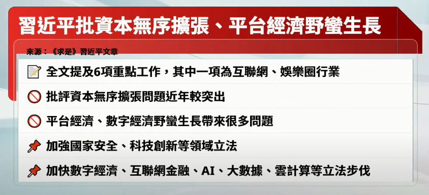 國家主席習近平在黨媒《求是》發表文章,內文提到五個要點,排第二位的是加快重點領域立法。當中包括加快推進反壟斷法、反不正當競爭法等修訂工作,重申近年資本無序擴張問題較突出,部分平台經濟、數字經濟野蠻生長、缺乏監管,帶來不少問題。他亦提到,要加快數字經濟、網際網路金融、人工智慧、大數據、雲計算等領域立法步伐。