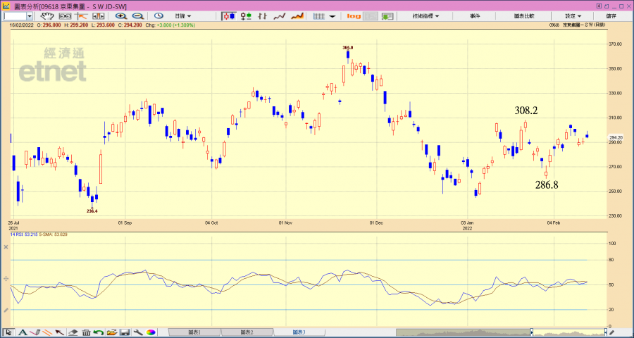 京東集團站穩289.4元後,較大機會上試308.2元附近。(《經濟通HV2報價系統》截圖)