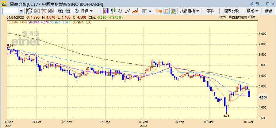 中生製藥今日跌7.98%收報4.5港元,成交4.19億港元,四環醫藥則無升跌,收報1.57港元。