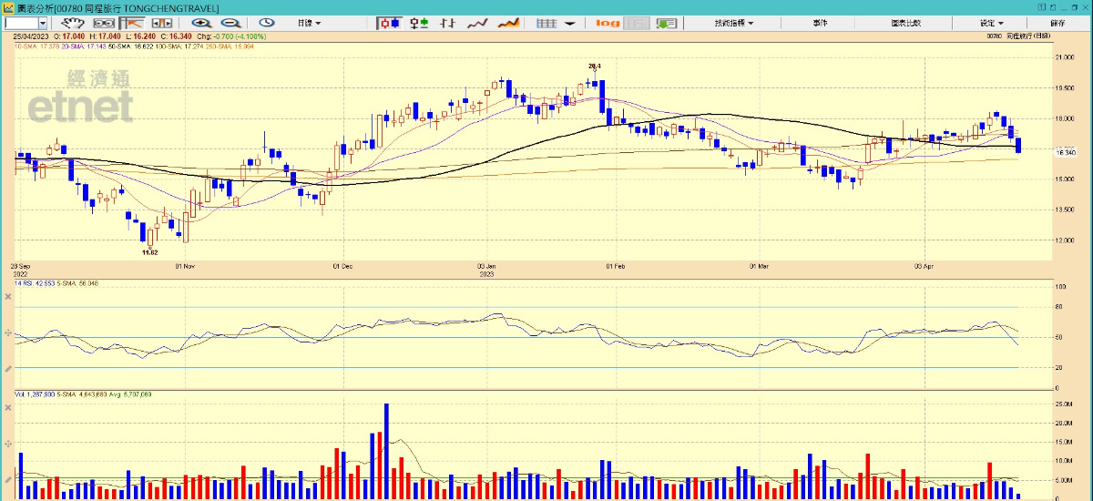 五一黃金周臨近,市場憧憬復常後首波旅遊熱潮,相關旅遊概念股有望帶動造好。但連敬涵指出,炒作「五一」應該要更早部署,目前距離「五一」尚餘約一周,相關概念股如同程(00780)及攜程(09961)反而跌跌不休,反映市場對相關股份毫無憧憬,絕不宜現時入手。