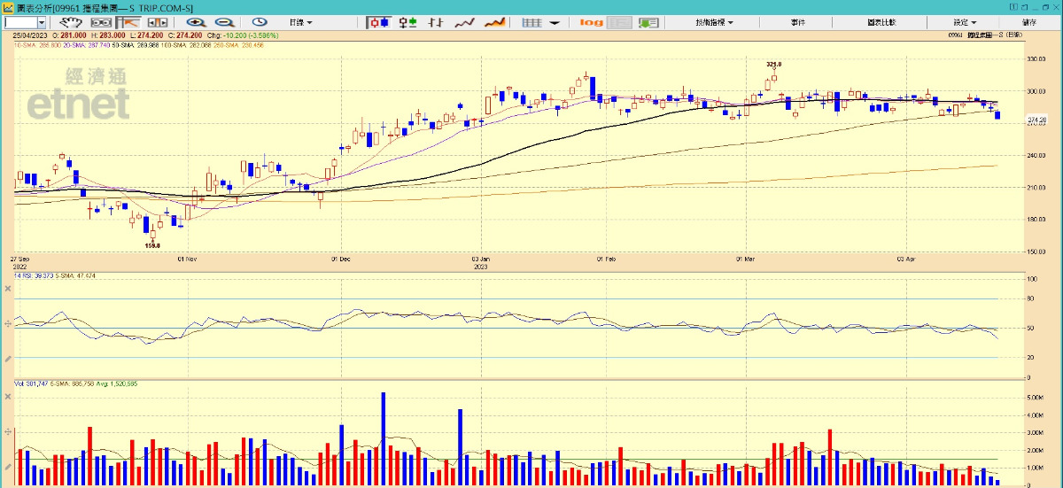 攜程股價自3月以來270元以上橫行。(經濟通HV2報價系統截圖)