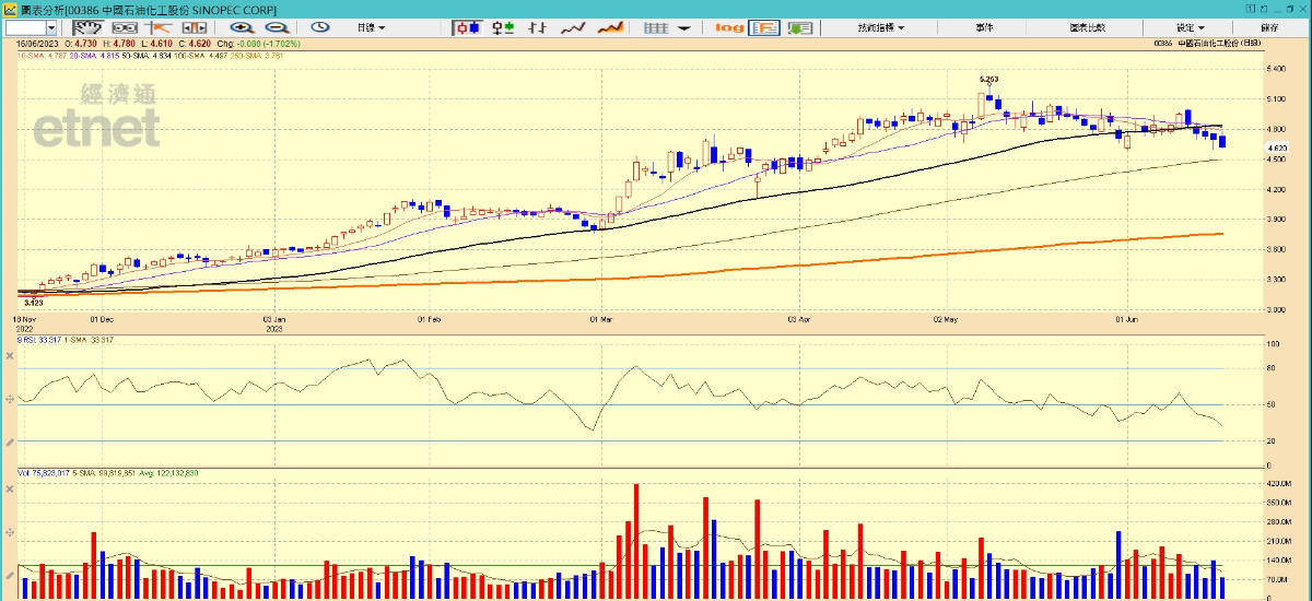 中石化股價走勢。(經濟通HV2報價系統截圖)
