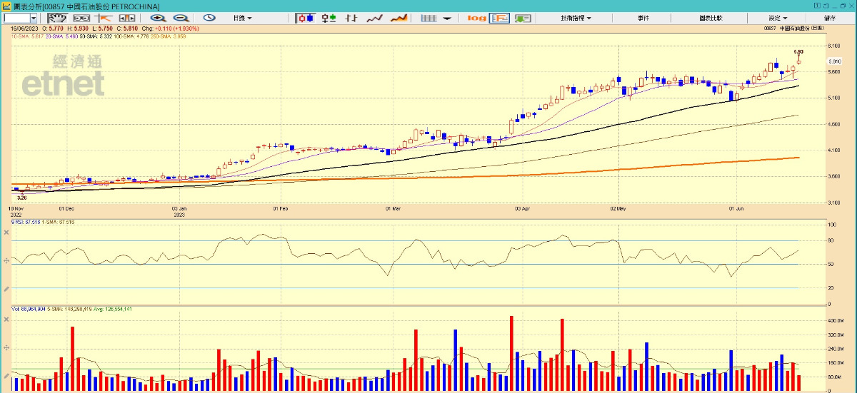 三桶油近期走勢分化,中海油(00883)及中石化(00386)回調之際,中石油(00857)再創近8年新高,逼近6元關口。李偉傑指中石油將於兩日後除淨,料與中海油及中石化一樣,股價在除淨後將會偏軟,不建議現時高追,可待除淨後回調至50天線約5.3元附近再部署。