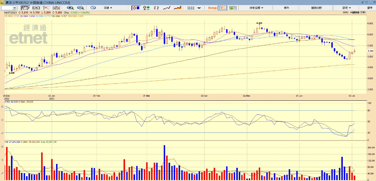 中國聯通股價走勢。(經濟通HV2報價系統截圖)