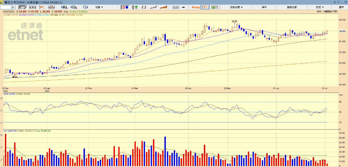 中國移動股價走勢。(經濟通HV2報價系統截圖)