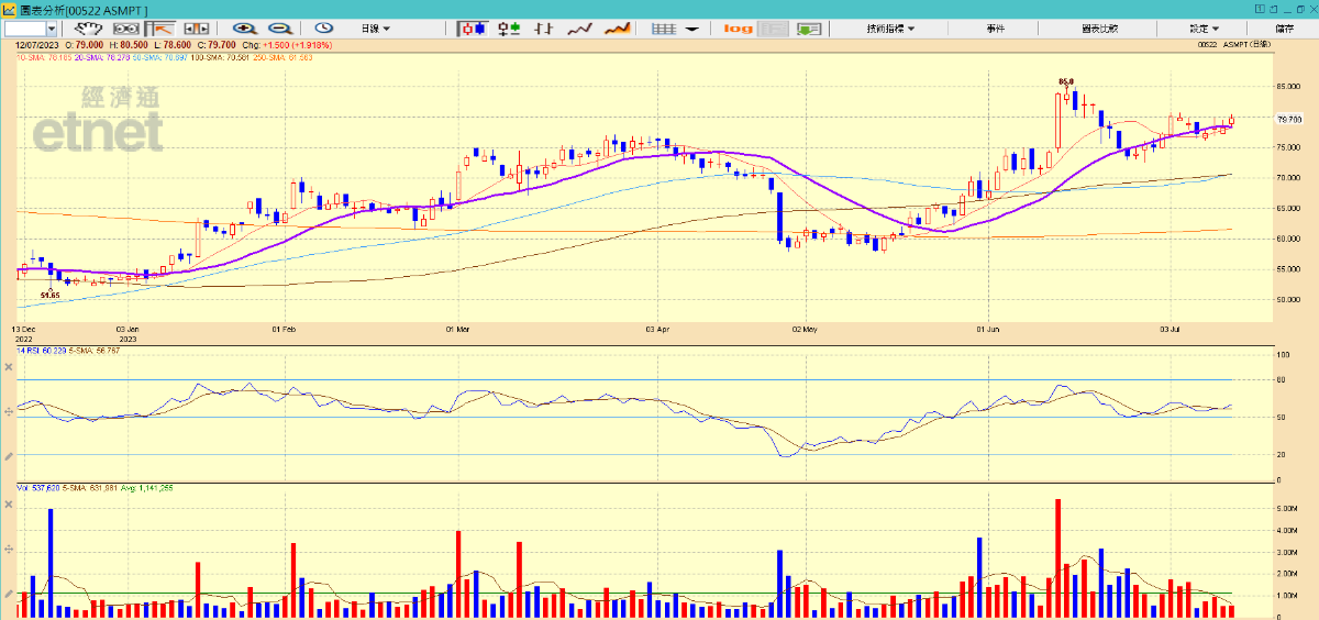 至於主營晶片生產儀器的ASMPT(00522),溫鋼城指其股價走勢較好,早前受惠荷蘭限制光刻機巨頭阿斯麥對華出口,市場憧憬ASMPT生意額有望提升,炒起股價。目前股價於85元有較大阻力,但預計一段時間後有機會突破,現時未偏離20天線太多亦可考慮部署。