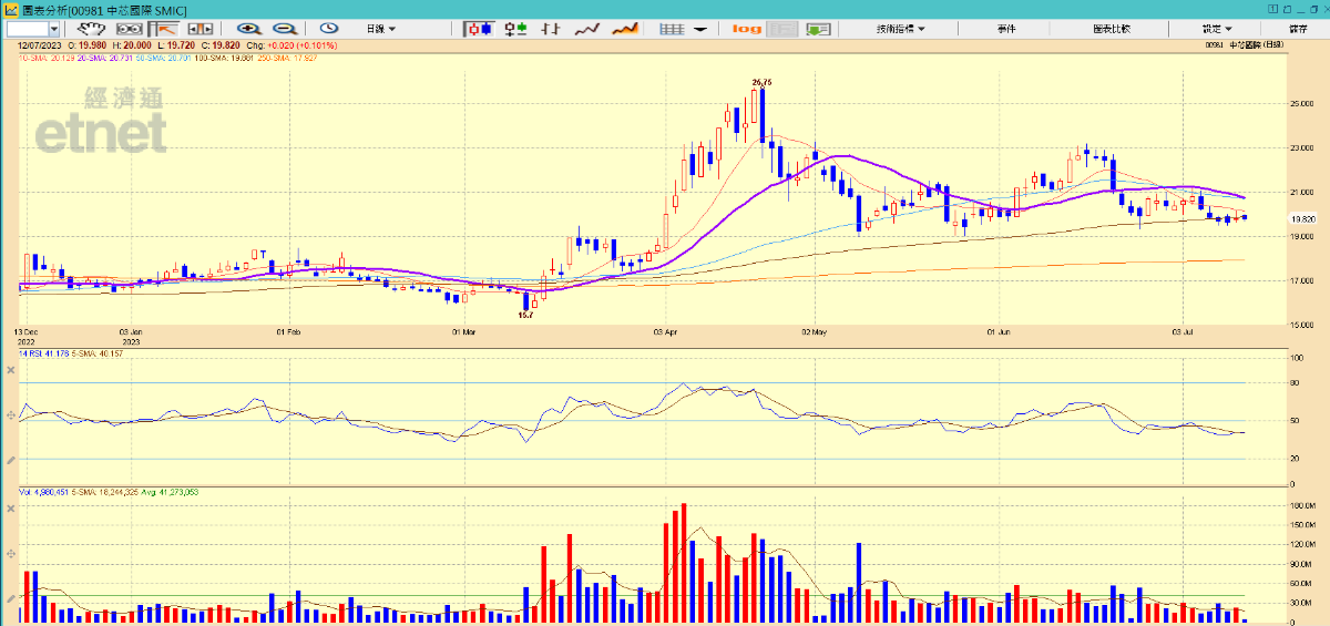 但他指,相關消息對內地晶片企業影響不大,因中芯(00981)及華虹(01347)等依賴內地市場都已經可以,故現時中芯受消息影響回落,至19元水平亦可以考慮入手,因為5月及6月時多次回落至19元後都見反彈,初步目標看月初高位約19.5元,最樂觀可見6月高位23元,但要留意目前市場預期中芯盈利倒退,要留意回吐風險。