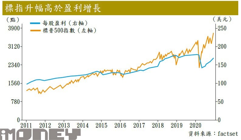 「今年股市上升的原因是估值膨脹,但估值沒可能永無止境地上升(見圖),所以我們在2021眾焦盈利增長,所以我們看好大市值、盈利質素好的增長型股票。」的確,隨著銀紙愈印愈多,聯儲局資產負債表由3月時的3.8萬億美元增至7萬億美元,股市估值的「通脹」非常厲害,大型股權重較大的標普500指數市盈率便高達29.3倍,遠高於過去5年歷史中位數的19.8倍。