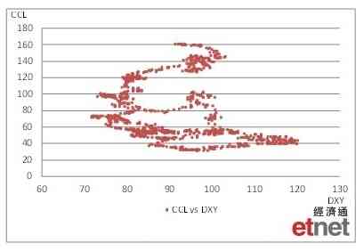 為了分析美元走勢對本港樓價的影響,本欄特別找來至今22年數據作系列分析。首先,我們以1995年中開始,每周公布的CCL與當周的美匯指數收市價作比較。若單純以數據本身列出,難以發現美匯(x軸)升跌,與CCL(y軸)的相關度。