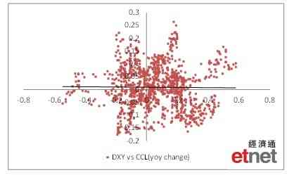 1995年6月至2017年10月CCL數據(y軸)與美匯(x軸)