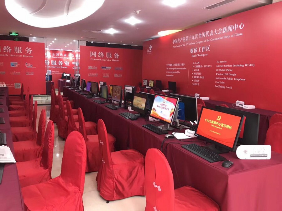 十九大新聞中心已提前開張,活動室背景板桌布椅套等等一律採用紅色 (駐京記者黃燕明攝)