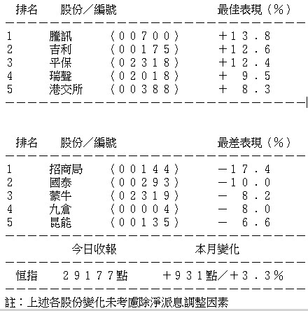 總結11月份恒指升931點或3.30%,收報29177點,高低波幅區間為28137點至30199點;今年首11個月升7176點或32.62%。