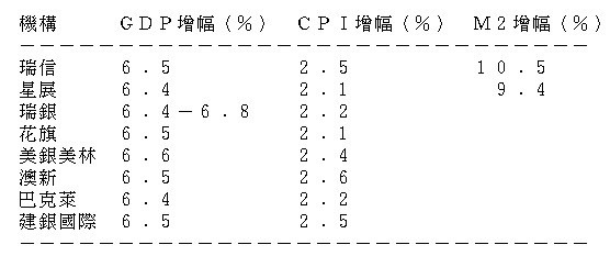 彭博調查各機構預測綜合數據顯示,明年GDP增速為6.4%,M2增9.4%。表列機構預測明年中國經濟數據: