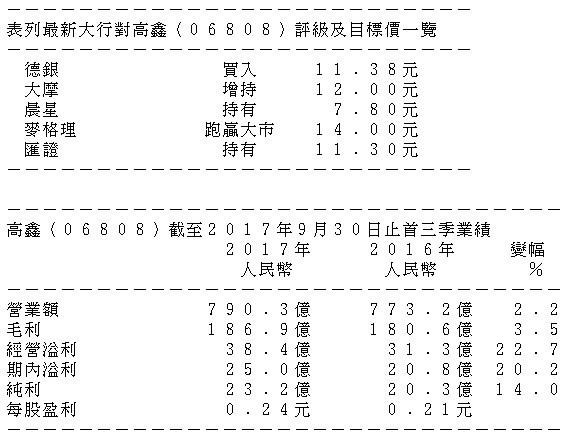 大摩預期高鑫2017至2019年銷售及盈利年複合增長率分別為8%及13%,同時上調2018至2019年銷售及盈利預測,料今年同店銷售增長改善,歸因於廣泛的快速消費品價格上升,將其目標價由7.6元升至12元,維持「增持」評級。