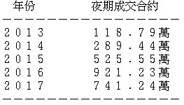 據港交所提供的資料顯示,自夜期於2013年4月推出以來,於過去五年間,夜期的每年成交量持續上升如下: