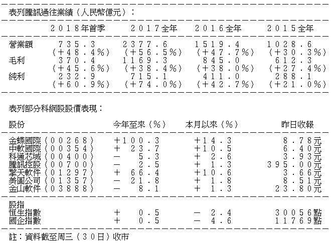 雖然騰訊股價近期仍然徘徊於400元附近,似乎未見如年初一樣的狂升姿態,但券商對於騰訊最近公布的季績卻表滿意,普遍評級正面。因為騰訊首季網絡遊戲收入按年增長26%至287.78億元人民幣,旗下智能手機遊戲(包括《王者榮耀》等現有遊戲以及《奇蹟MU:覺醒》與《QQ飛車手遊》等新遊戲)開始利潤化(Monetisation),為公司帶來強勁收入。公司首季純利232.9億元人民幣,按年升61%,遠高於市場預期的174.2億元人民幣。因此,不少大行均調高騰訊2018年至2020年的收入預測,當中高盛指,騰訊手遊收入持續增長,線上廣告收入好過預期,以及其他支付及雲業務收入有增加,未來三年度收入預測提升1至4%。該行更加給出546元目標價,評級維持「買入」。