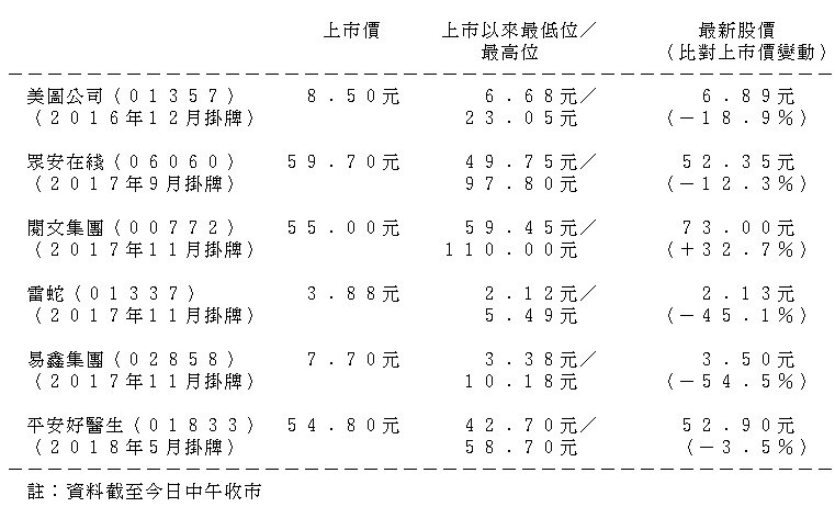 綜合近一年半在港掛牌的七隻焦點新經濟股,普遍獲極大幅度的超額認購,投資者中籤率極低。掛牌之後,股價即時衝高,然而上日數日之間創出高位後反覆向下,持續尋底,以現價比對上市價,絕大部分仍然「潛水」(見下表)。七隻新經濟股中,目前只有閱文(00772)仍然「浮水」,現價仍比上市高出逾三成。而在在各公司之業績,目前只有閱文錄得盈利,其他的仍然「見紅」,何時虧轉盈未可得知。
