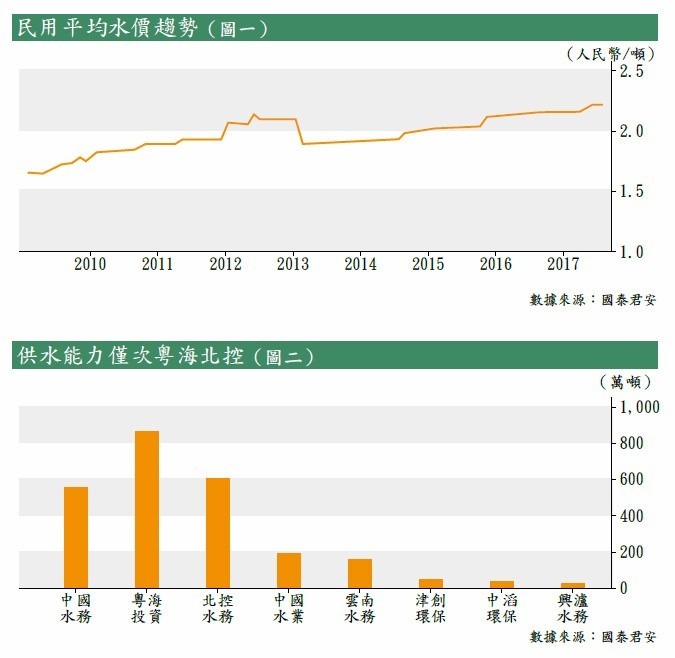 水務行業在內地錢途巨大,可從供求及價格兩大層面顯現。首先,內地水資源供不應求人所共知,根據聯合國人居住環境署評級標準,全國極度及中度缺水的省市接近20個,當中上海及北京等一線城市更榜上有名。加上全國河水污染問題嚴重,不論是供水系統以至污水處理的項目建設需求,皆同樣高企。另一方面,內地民用水價經過多次上調後,水平仍然較發達國家偏低,未能體現其稀缺性。相信可見將來,可繼續保持漲勢(見圖一),增加相關投資的吸引力。