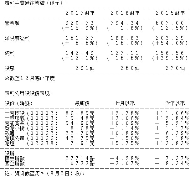 今年2月份,中電交出令市場滿意的年度成績表。中電截至去年12月底止全年盈利為142.49億元增加12.1%,表現好過市場預期,當時宣派第四期中期股息為每股1.14元增加4.6%,連同首三次已付中期股息,2017年度公司總股息為每股2.91元,按年增加3.9%,難怪中電一直吸引「好息」的投資者。