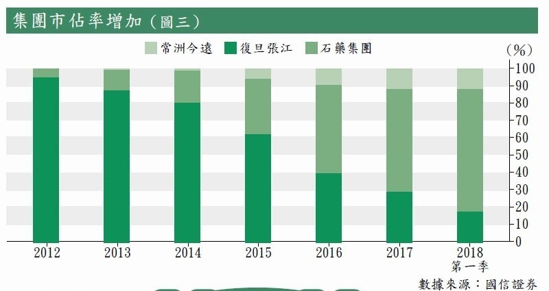 多美素目前已進入3個省份的醫保,國信證券指出,由於多美素相比其他同類藥品更有優勢,加上石藥採取自營的銷售模式,2013年到2017年的複合年均增長率高達82.6%,市佔率持續向上,現時在醫院的市佔率高達七成以上(見後頁圖三)。