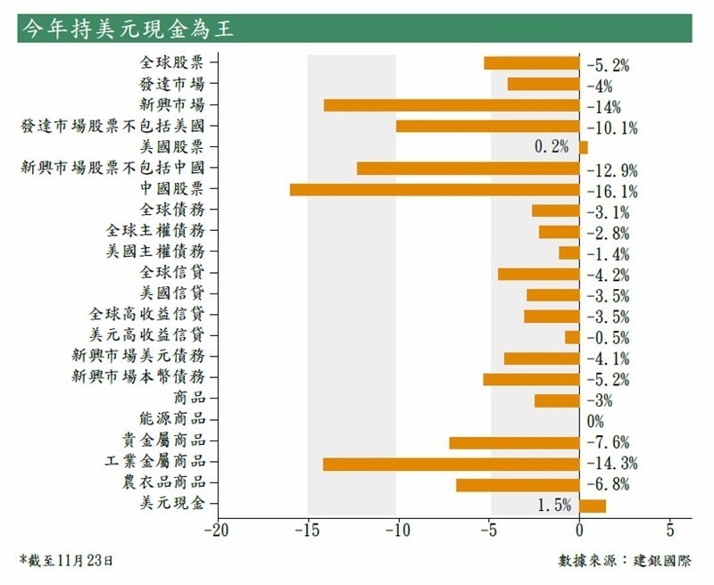 若以一句話總括去年環球投資市場表現,輸少當贏會是相當貼切。埋單計數去年全球資產表現,幾乎所有資產均錄負回報(見圖),只有持美元現金錄得正數。今年走勢無人可未卜先知,但在股市永遠Prepare for the worst,對投資者來說可謂相當重要。