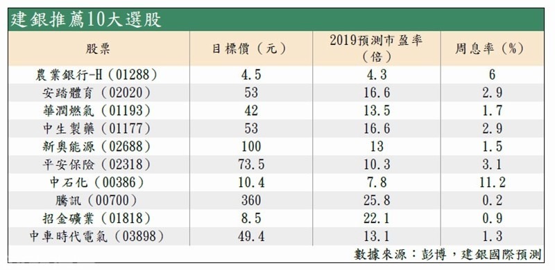 要對突發性金融危機及美元下跌的風險,黃金自然是避險之選,可佔整個組合約15%。建銀對黃金看法明顯偏牛,指金價今年可回升至每盎司1,400美元,而該行推薦的行業首選為內地純正黃金生產商招金(01818)。該股去年以來一直跑贏大市,若美元真如該行預料在第一季附近見頂,屆時或是全年計吸納黃金或相關資產的大好機會。