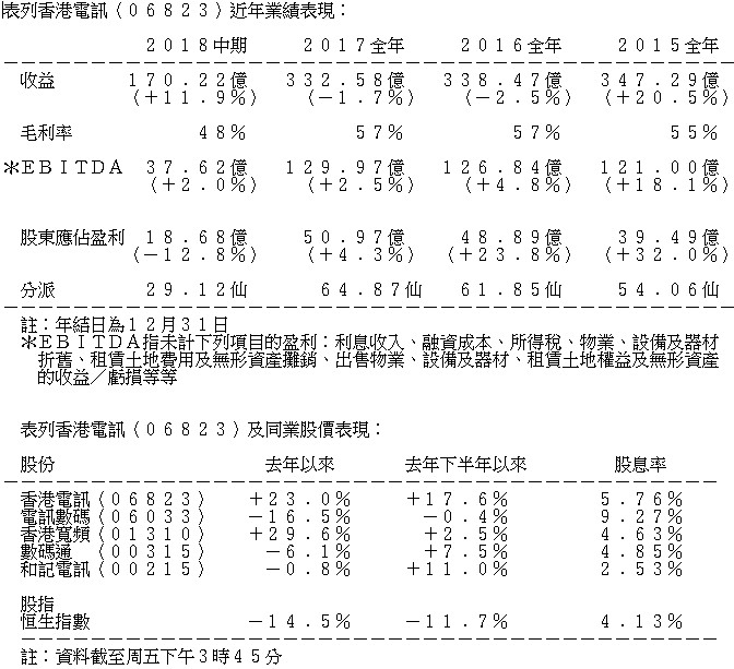 2018年世界盃在6月至7月舉行,新iPhone在下半年推出,流動電訊服務營運商下半年才紛紛加價,香港電訊2018年上半年的業績表現未能受惠上述因素,整體表現不過不失,總收入按年上升近12%至170.22億元;毛利率由2017年下半年的50%下降至2018年上半年的48%,未計流動通訊產品銷售的毛利率則由59%上升至60%;純利按年下跌12.7%至18.68億元,每股中期分派增加3.6%至0.2912元,與每股經調整資金流一致。
