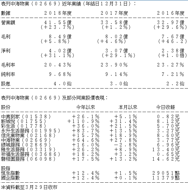 物業管理公司中海物業(02669)已公布2018年全年業績,純利增長31%。該公司已償還全部銀行貸款,未來將積極擴充業務。預料大行對中海物業評價日後會有所提升,股價望有上升。