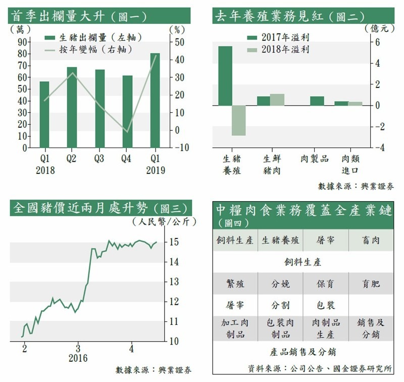 一場非洲豬瘟波及全國豬隻供應,國家農業農村部近日更帶頭唱好豬價,使資金對中糧肉食(01610)垂涎欲滴。該股最近公布首季經營數據,多間券商確認集團受惠於豬價周期逆轉,今年止血在望,「味道」相信依然吸引。